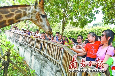 28日,深圳野生動(dòng)物園里的長頸鹿吸引眾多游客駐足觀賞。記者 朱洪波 攝