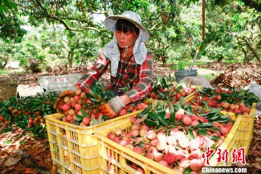 全球荔枝最大產(chǎn)地廣東茂名荔枝“妃子笑”品種喜獲歷史性大豐收。圖為果農(nóng)在采摘荔枝!∥澍Q 攝