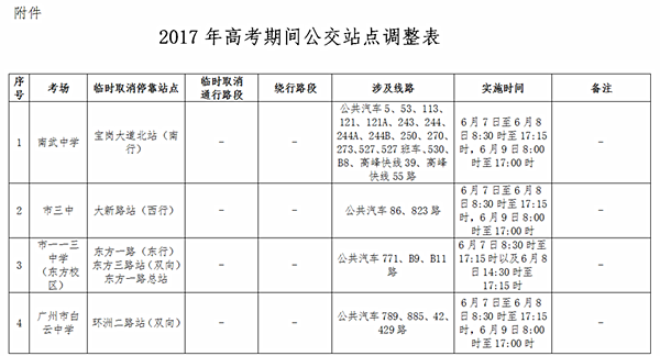 南方網訊 2017年高考和普通高中學業(yè)水平考試將于6月7日至6月9日進行。為做好考試期間的公交服務保障工作,結合考場周邊的交通管制情況,廣州市交通部門將對市協(xié)和中學、第三中學等10個考場周邊的公交站點進行臨時調整: