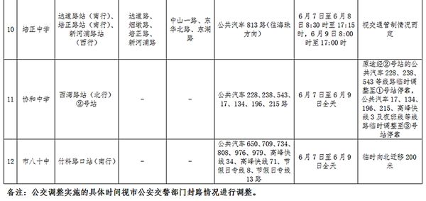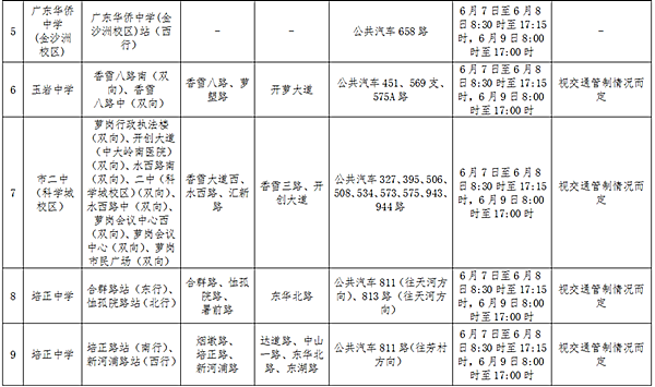 一、6月7日至6月9日,每日8:30至17:15(6月9日為8:00至17:00),廣州市交通部門將臨時撤銷公共汽車寶崗大道北站(南行)、大新路站(西行)、環(huán)洲二路站(雙向)、廣東華僑中學(金沙洲校區(qū))站(西行);臨時撤銷公共汽車合群路站、恤孤院路站、培正路站、新河浦路站;公共汽車813路往海珠方向臨時取消?抗财囘_道路站(南行)。