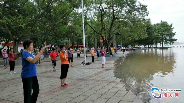 據(jù)南方網(wǎng)報(bào)道,7月4日上午8時(shí),記者從肇慶封開(kāi)縣舊縣城江濱公園看到,昨天傍晚起天氣由雨轉(zhuǎn)陰,上午8時(shí)許雖然可見(jiàn)烏云,但是舊縣城水位開(kāi)始下退,江濱公園迎來(lái)了一大批晨運(yùn)的市民。