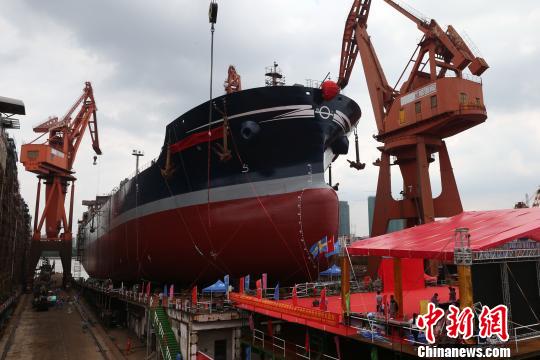 在廣船國(guó)際廣州荔灣廠區(qū)3號(hào)船臺(tái)建造的最后一艘船——5萬(wàn)噸級(jí)化學(xué)品/成品油“威士比大西洋”號(hào)10日下水 鐘偉 攝