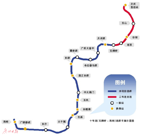線路圖顯示,十號(hào)線共設(shè)置14座車站,其中換乘站8座,分別為天河路(換乘一、三號(hào)線)、東湖(換乘六、十二號(hào)線)、濱江東路(換乘十九號(hào)線)、五鳳(換乘十一號(hào)線)、東曉南(換乘二號(hào)線)、石溪(換乘廣佛線)、廣鋼新城(換乘佛山十一號(hào)線)、西朗(換乘一、二十二、廣佛線)。