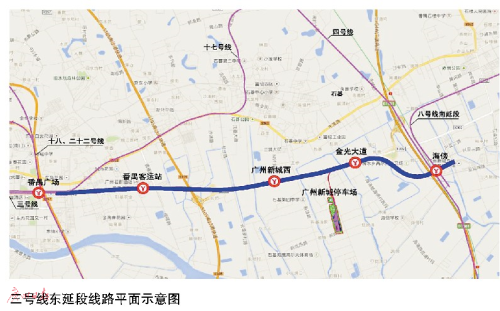 三號(hào)線東延段(番禺廣場-海傍)全長9.58公里,均為地下線。線路西起于三號(hào)線番禺廣場站,沿亞運(yùn)大道向東延伸,共設(shè)4座車站,自西往東依次為番禺客運(yùn)站、廣州新城西、金光大道和海傍。其中換乘站1座,為海傍站,可換乘已通車的四號(hào)線,及遠(yuǎn)期規(guī)劃的八號(hào)線南延段。