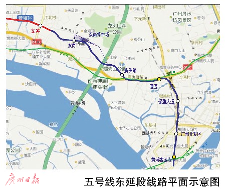 五號(hào)線東延段(文沖-黃埔客運(yùn)港)全長9.76公里,全部為地下線。線路西起五號(hào)線文沖站,途經(jīng)雙崗、黃埔東路、開發(fā)大道,共設(shè)車站6座(不含文沖),西往東依次為雙崗、廟頭路、夏園、保盈大道、廣州開發(fā)區(qū)、黃埔客運(yùn)港。其中換乘站2座,夏園換乘地鐵十三號(hào)線,黃埔客運(yùn)港換乘遠(yuǎn)期規(guī)劃的八號(hào)線支線、東莞一號(hào)線。
