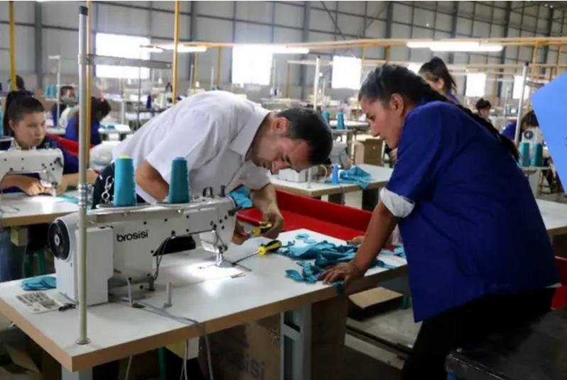 在伽師縣宇信服裝有限公司的工廠(chǎng)內(nèi),帶隊(duì)老師主動(dòng)承擔(dān)起機(jī)器的維修工作,確保學(xué)生能夠正常工作。