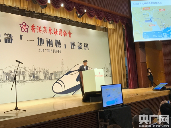 香港路政署鐵路拓展處副處長陳彩偉在座談會一開始講解“一地兩檢”方案。