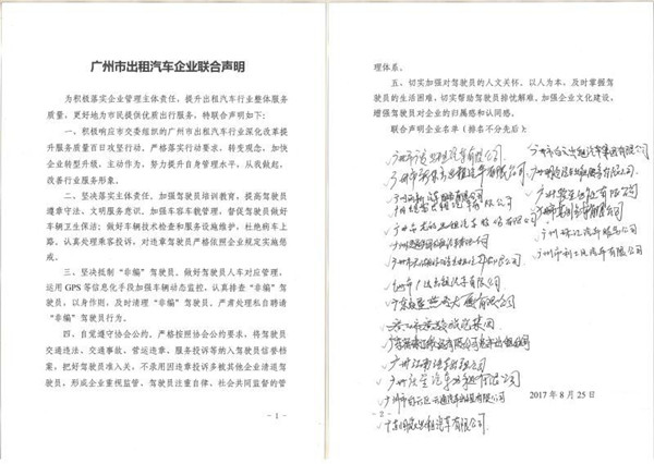 聯(lián)合聲明企業(yè)名單如下(排名不分先后):廣州市白云出租汽車集團(tuán)有限公司、廣州交通集團(tuán)出租汽車有限公司、廣州市廣駿旅汽集團(tuán)、廣州市天湖旅游出租汽車有限公司、廣州市廣發(fā)出租汽車有限公司、廣州市新東方出租汽車有限公司、廣州蜆富出租汽車有限公司、廣州市利士風(fēng)汽車有限公司、廣州市龍的出租汽車福分有限公司、廣州明通汽車出租服務(wù)有限公司、廣州慶星汽車出租有限公司、廣州市白云區(qū)云通汽車出租有限公司、廣州市廣達(dá)出租汽車有限公司、廣東國(guó)旅出租汽車有限公司、廣州聯(lián)星出租有限公司、廣東農(nóng)墾燕嶺大廈有限公司、廣州東方汽車有限公司、廣東省珠江航運(yùn)有限公司汽車出租分公司、廣州珠江汽車服務(wù)公司、廣州麗新汽車服務(wù)有限公司、廣州江南汽車出租公司