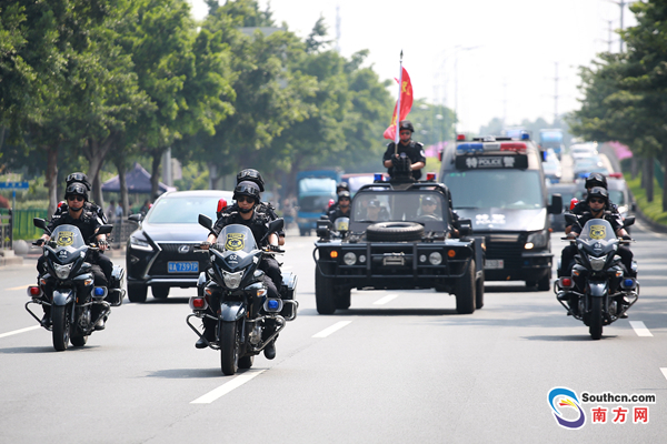 9時30分,隨著演練總指揮、海珠區(qū)副區(qū)長、區(qū)公安分局長譚偉文一聲令下,演練正式開始,F(xiàn)場模擬一場大型展會期間,4名“不法分子”突然駕車闖入展館外圍安檢區(qū)域,襲擊群眾,造成多人受傷的突發(fā)情況。海珠區(qū)公安分局指揮中心接報后,立即指令羊城突擊隊海珠分隊迅速趕赴現(xiàn)場處置。