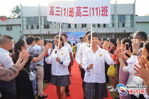 鮮花、拱門(mén)、紅地毯……16日,廣東實(shí)驗(yàn)中學(xué)附屬天河學(xué)校(下稱“省實(shí)附中”)室內(nèi)體育館張燈結(jié)彩,省實(shí)附中2018屆高三學(xué)子在這里舉行成人禮。