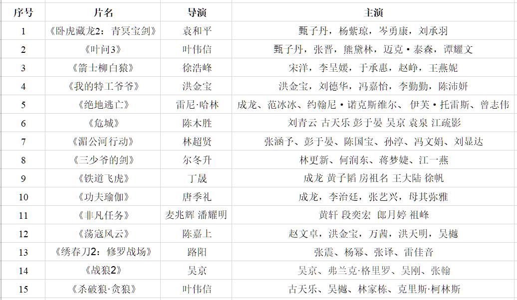 據(jù)介紹,本屆評(píng)選范圍涵蓋了2016年至2017年10月的130多部國產(chǎn)動(dòng)作功夫電影。經(jīng)過層層篩選,最終確定15部影片入圍,當(dāng)中包括大家耳熟能詳?shù)摹度~問3》、《絕地逃亡》、《湄公河行動(dòng)》、《繡春刀2:修羅戰(zhàn)場(chǎng)》以及今年大熱的《戰(zhàn)狼2》。