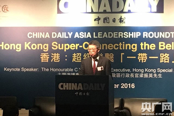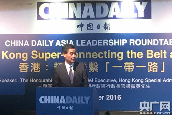 央廣網(wǎng)香港12月7日消息(記者周偉琪)12月7日,由中國(guó)日?qǐng)?bào)社主辦的“香港:超級(jí)聯(lián)系‘一帶一路’圓桌論壇”在香港會(huì)議展覽中心舉行。香港特別行政區(qū)行政長(zhǎng)官梁振英及多名政、商和學(xué)界人物作主題演講。