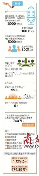 去年以來,全省共評出“廣東好人”99名,其中48名入選“中國好人”。全年共評選表彰6名“南粵楷模”。全國道德模范李玉枝家庭等13戶廣東家庭被授予第一屆全國文明家庭榮譽稱號。