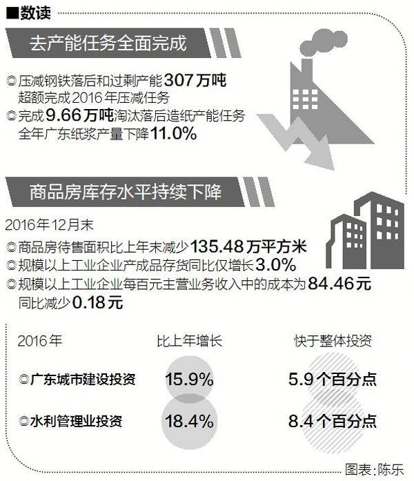 經(jīng)過近一年的實踐,廣東交出了這樣的成績單:2016年,廣東實現(xiàn)地區(qū)生產(chǎn)總值79512.05億元,同比增長7.5%。這一年,廣東壓減鋼鐵落后和過剩產(chǎn)能307萬噸,超額完成任務(wù);國有關(guān)停類“僵尸企業(yè)”實現(xiàn)市場出清2394戶;進(jìn)一步清理規(guī)范行政事業(yè)性收費,每年為企業(yè)減負(fù)131億元;啟動補(bǔ)短板重大工程,將18項、總投資2.25萬億元的補(bǔ)短板重大工程納入省重點項目調(diào)度。