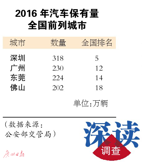 公安部交管局?jǐn)?shù)據(jù)顯示,截至2016年底,全國(guó)機(jī)動(dòng)車保有量達(dá)2.9億輛,其中汽車1.94億輛,新車上牌量高達(dá)2752萬(wàn)輛,汽車保有量?jī)粼?212萬(wàn)輛,均為歷史最高水平。深圳、廣州、東莞、佛山分別以318萬(wàn)輛、230萬(wàn)輛、224萬(wàn)輛、202萬(wàn)輛,排名全國(guó)第5、第12、第14位和第18位。由此得知,這四個(gè)城市汽車保有量已超過(guò)974萬(wàn)輛。由于2016年佛莞汽車保有量激增約60萬(wàn)輛,據(jù)此推算,今年廣深佛莞汽車保有量破千萬(wàn)已無(wú)懸念。
