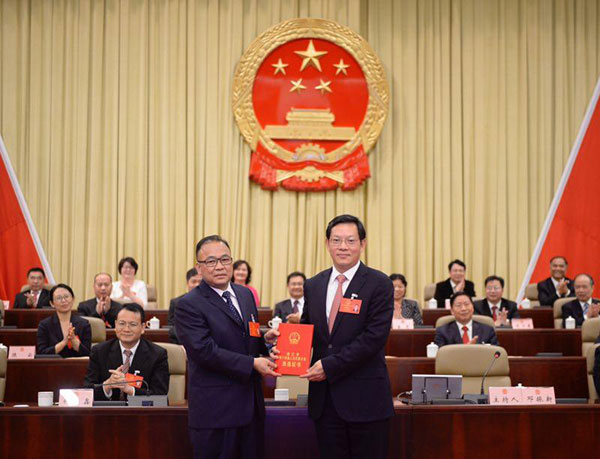 鄧振新代表大會(huì)主席團(tuán)給新當(dāng)選的市人大常委會(huì)主任鄭人豪頒發(fā)當(dāng)選證書(shū)。