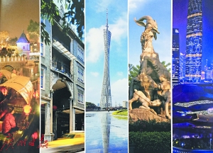 報(bào)告封面,廣州塔、騎樓、五羊雕塑、西塔及荔枝灣涌的五張圖片穿插呈現(xiàn),展示了廣州的傳統(tǒng)與現(xiàn)代,文化與經(jīng)濟(jì)。