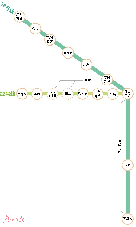雖然22號(hào)線建設(shè)工程的起點(diǎn)為番禺廣場(chǎng),但事實(shí)上線路通車初期在番禺廣場(chǎng)以南與18號(hào)線共線運(yùn)行,共用“番禺廣場(chǎng)-萬頃沙”的走廊。因此,22號(hào)線實(shí)際運(yùn)營的起點(diǎn)為萬頃沙,屆時(shí)從萬頃沙樞紐開出的列車,既有開往廣州東站的18號(hào)線,也有去往廣州南站的22號(hào)線,實(shí)現(xiàn)對(duì)外交通樞紐之間的快速聯(lián)系。