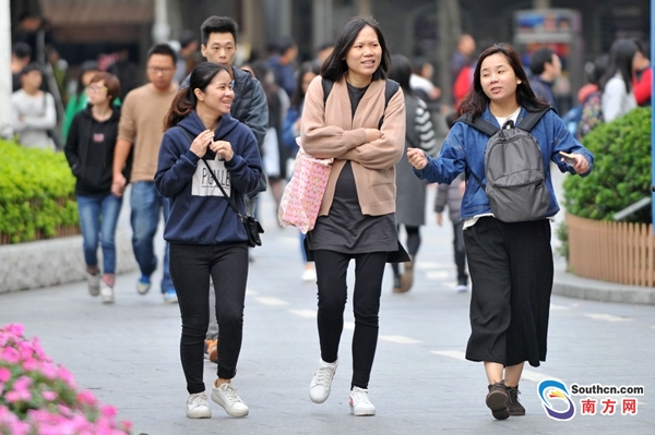 佛山祖廟路,周末降溫,怕冷的市民穿上厚衣服。 南方日?qǐng)?bào)記者 戴嘉信 攝