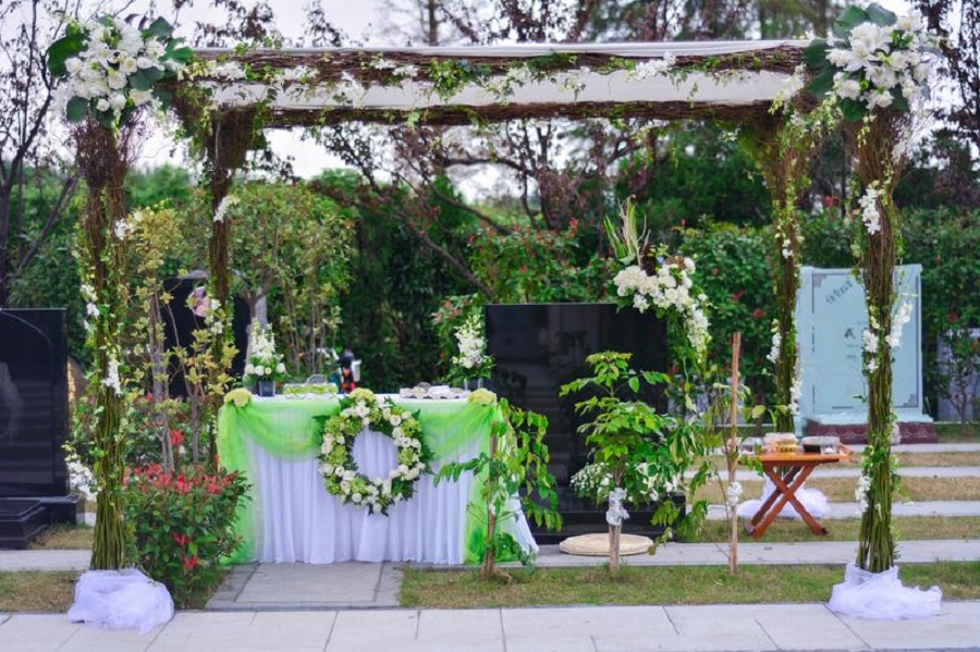 白玫瑰,綠帳幔,小風(fēng)鈴,水晶吊墜,羅馬柱,以及用若干老照片做成的“時光通道”,上面是一對夫婦從黑發(fā)到白頭的合影留念。如果沒有看到桌面上擺放的兩只靈盒,許多人可能會誤以為這是一對金婚夫婦的紀念日現(xiàn)場,畢竟鮮少有人能將這些唯美而溫馨的元素與葬禮聯(lián)系到一起。