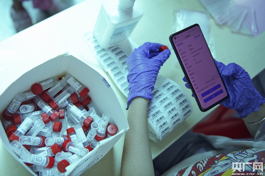 醫(yī)護(hù)人員核驗(yàn)市民預(yù)約信息,發(fā)放采樣瓶。(央廣網(wǎng)記者 官文清攝)
