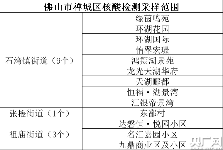 佛山市禪城區(qū)核酸檢測采樣范圍(央廣網(wǎng)記者 夏燕 制表)