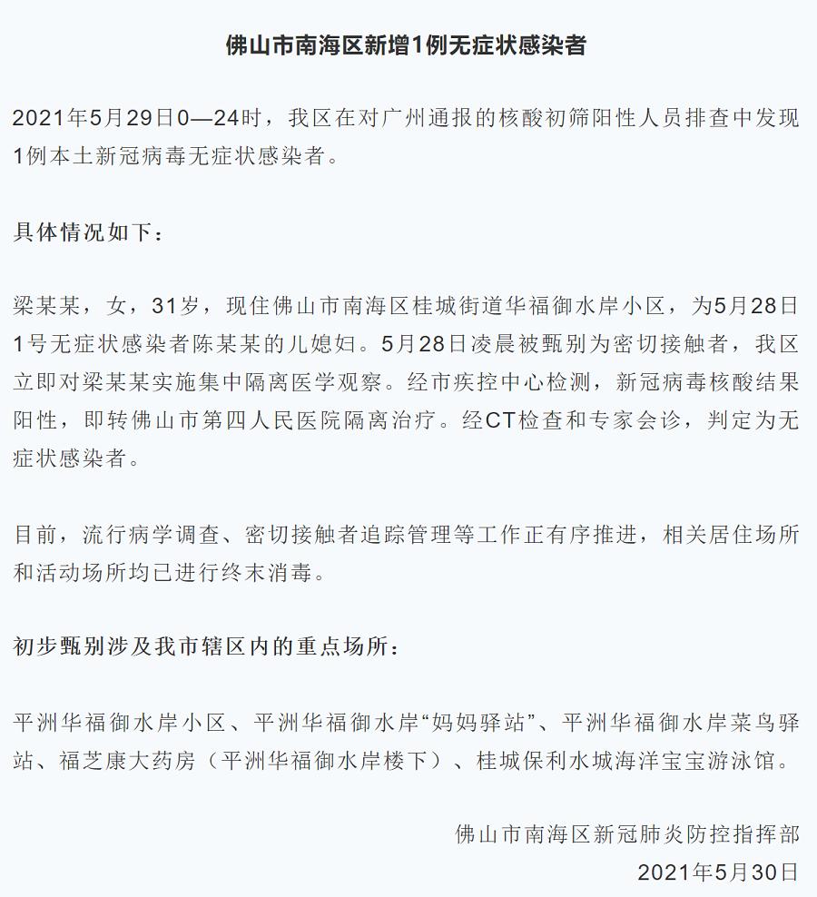 央廣網(wǎng)佛山5月30日消息(記者 夏燕)佛山市南海區(qū)新冠肺炎防控指揮部今早通報(bào):5月29日0—24時(shí),南海區(qū)在對(duì)廣州通報(bào)的核酸初篩陽(yáng)性人員排查中,發(fā)現(xiàn)1例本土新冠病毒無(wú)癥狀感染者,系28日1號(hào)無(wú)癥狀感染者陳某某的兒媳婦。至此,其一家四口均被判定為確診或無(wú)癥狀感染者。