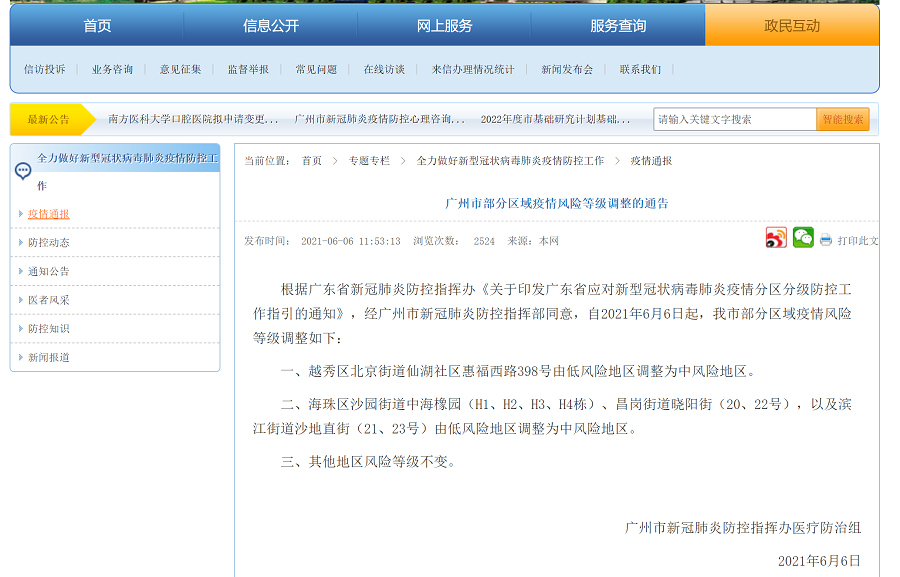 央廣網(wǎng)廣州6月6日消息(記者 張勝強)根據(jù)廣東省新冠肺炎防控指揮辦《關(guān)于印發(fā)廣東省應(yīng)對新型冠狀病毒肺炎疫情分區(qū)分級防控工作指引的通知》,經(jīng)廣州市新冠肺炎防控指揮部同意,自2021年6月6日起,我市部分區(qū)域疫情風(fēng)險等級調(diào)整如下: