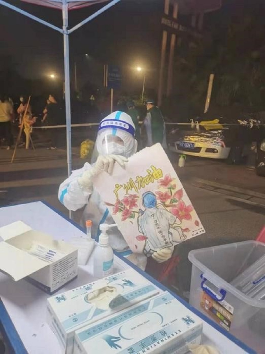 在花都豪駿名苑采樣點,市民為醫(yī)護人員送上暖心畫作,表達對白衣天使的感謝。