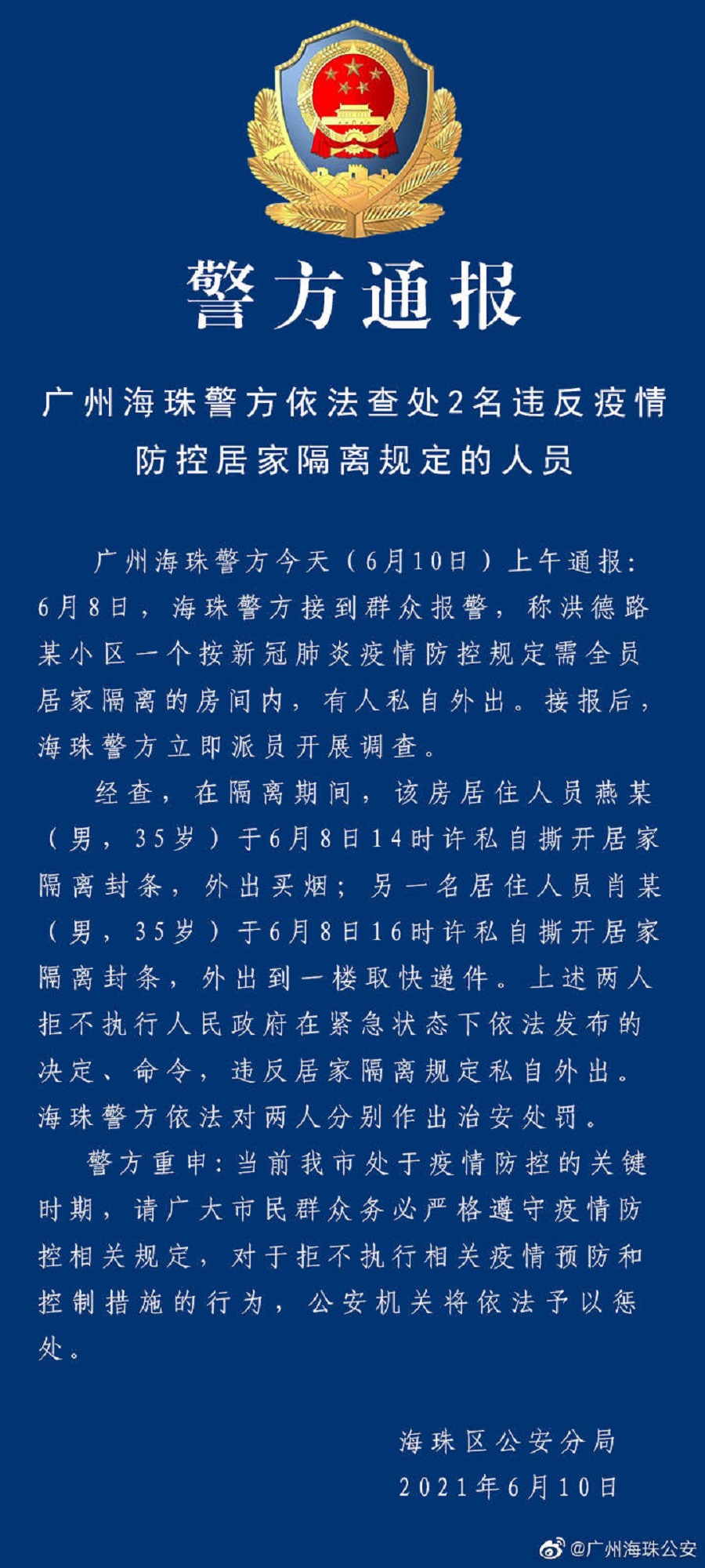 經(jīng)查,在隔離期間,該房居住人員燕某(男,35歲)于6月8日14時許私自撕開居家隔離封條,外出買煙;另一名居住人員肖某(男,35歲)于6月8日16時許私自撕開居家隔離封條,外出到一樓取快遞件。上述兩人拒不執(zhí)行人民政府在緊急狀態(tài)下依法發(fā)布的決定、命令,違反居家隔離規(guī)定私自外出。海珠警方依法對兩人分別作出治安處罰。