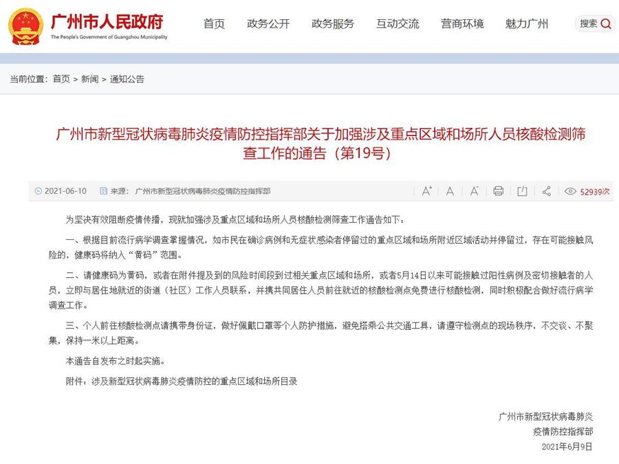央廣網(wǎng)廣州6月11日消息(記者 夏燕)6月10日晚,廣州市新型冠狀病毒肺炎疫情防控指揮部發(fā)布關(guān)于加強(qiáng)涉及重點(diǎn)區(qū)域和場(chǎng)所人員核酸檢測(cè)篩查工作的通告(第19號(hào)):即日起,加強(qiáng)涉及重點(diǎn)區(qū)域和場(chǎng)所人員核酸檢測(cè)篩查。