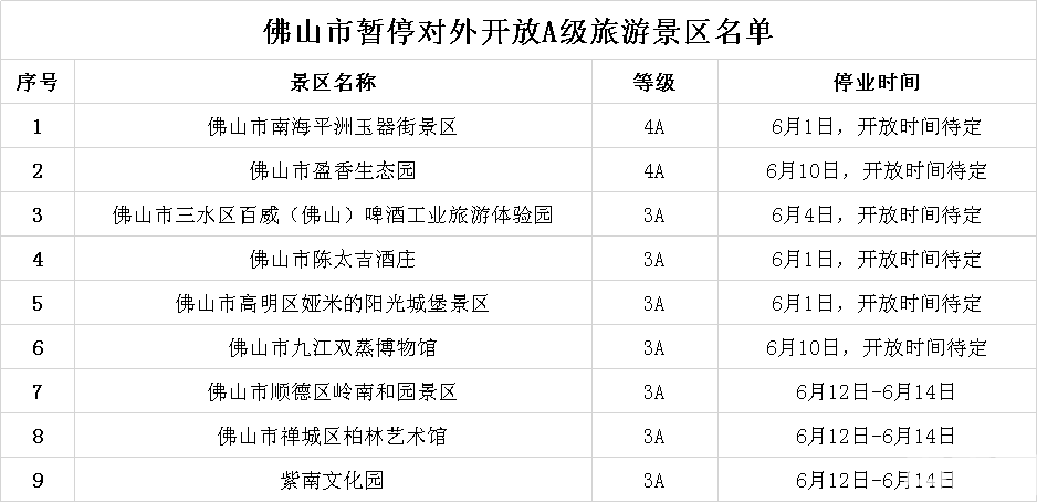 央廣網(wǎng)佛山6月11日消息(記者 張勝?gòu)?qiáng)、通訊員 佛宣)端午假期臨近,佛山市文化廣電旅游體育局發(fā)布《關(guān)于做好2021年“端午”假期疫情防控和安全工作的通知》(以下簡(jiǎn)稱(chēng)“通知”)。受疫情影響,全市9家A級(jí)景區(qū)暫停開(kāi)放,重新開(kāi)放時(shí)間待定。