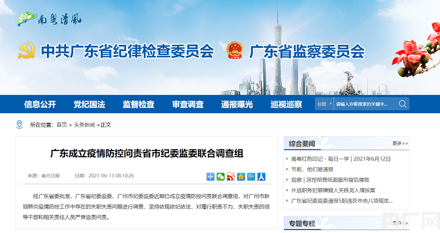據(jù)廣東省紀(jì)委監(jiān)委網(wǎng)站消息,經(jīng)廣東省委批準(zhǔn),廣東省紀(jì)委監(jiān)委、廣州市紀(jì)委監(jiān)委近期已成立疫情防控問責(zé)聯(lián)合調(diào)查組,對廣州市新冠肺炎疫情防控工作中存在的失職失責(zé)問題進(jìn)行調(diào)查,堅持依規(guī)依紀(jì)依法,對履行職責(zé)不力、失職失責(zé)的領(lǐng)導(dǎo)干部和相關(guān)責(zé)任人員嚴(yán)肅追責(zé)問責(zé)。