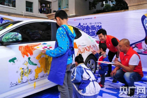 現(xiàn)場,“滴滴敢扶繪車公益活動(dòng)”中,自閉癥兒童拿起手中的畫筆在由滴滴出行提供的車輛上進(jìn)行手繪,畫出他們心中的色彩。同時(shí),滴滴出行還將畫展的部分畫作制成車貼,4月5日起免費(fèi)向車主提供。