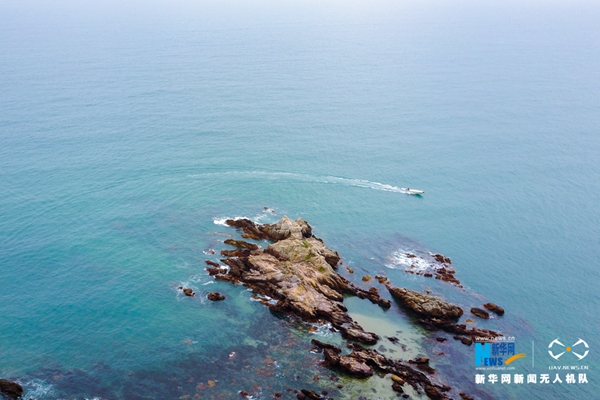 蔚藍(lán)的海,海浪拍打著礁石,船只穿過(guò),好一幅美麗的畫(huà)卷。新華網(wǎng)發(fā)(陳楷攝)