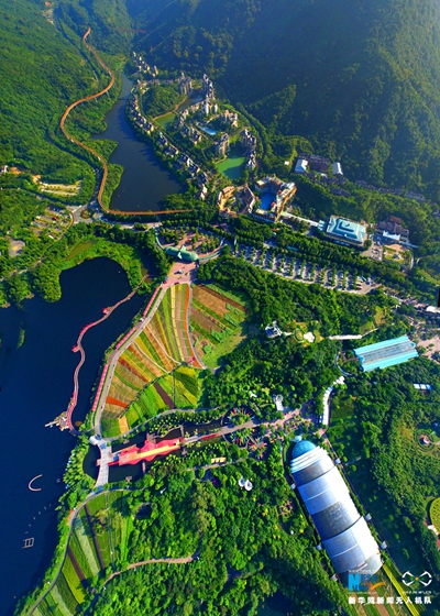 俯視茶溪谷,有溫室、花田、湖泊,還有遠(yuǎn)處彎曲的小火車路。新華網(wǎng)發(fā)(藍(lán)遠(yuǎn)峰攝)