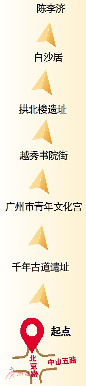 北京路文物徑一期設于北京路中段,以北京路與中山五路交界處為起點,經(jīng)過千年古道遺址、廣州市青年文化宮、越秀書院街、拱北樓遺址、白沙居、陳李濟,串聯(lián)起北京路中段的6大重要歷史文化資源。整個路徑長約500米,這也是廣州首條由政府建造的文物徑。