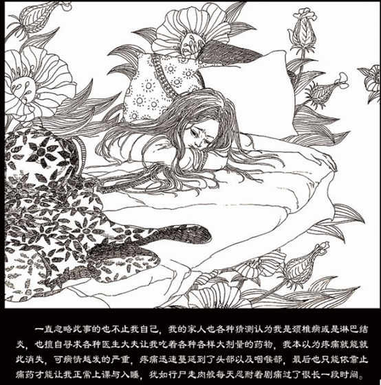 日記是朱泳珊在治療鼻咽癌的過(guò)程中,繪制的一部漫畫。該漫畫是黑白鉛筆畫,一共33張。每一幅畫后都配有一段簡(jiǎn)短的文字,概括了她生病、治病和病愈的整個(gè)過(guò)程。在向人介紹病痛的同時(shí),傳遞著滿滿的正能量。