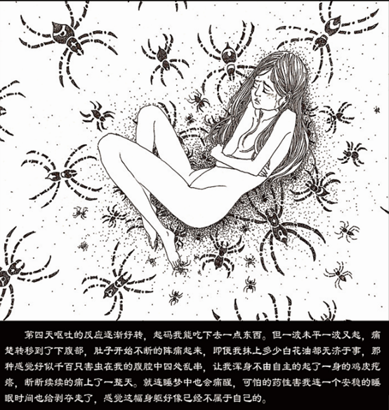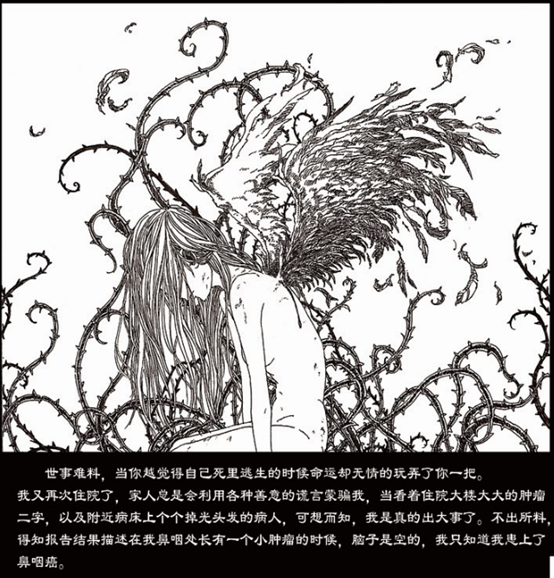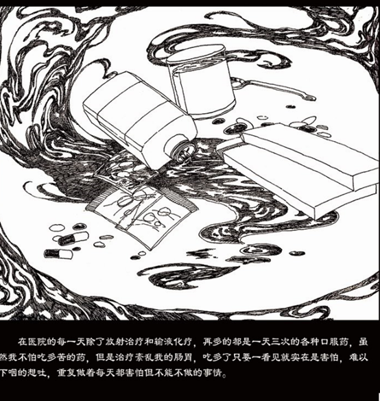 “奶白色的化療藥物濃郁得像牛奶一樣,刺眼的紅色圓點(diǎn),貼在瓶子上,示意著這瓶藥性強(qiáng)烈的藥水正往我的血液里鉆,藥性可怕得能殺死我所有的細(xì)胞。艱苦的經(jīng)歷就此開(kāi)始了,第一天的化療就十多瓶的藥水,一直打到了晚上。