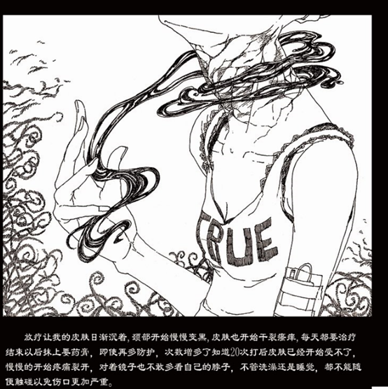 和放療的過(guò)程相比,隨后的副作用更考驗(yàn)著人的承受力和意志力。低燒、嘔吐、失眠、口腔潰瘍一直困擾著她,就連皮膚也發(fā)生了變化。