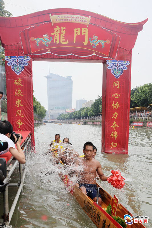 龍舟隊(duì)伍沖過(guò)龍門(mén)