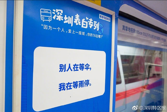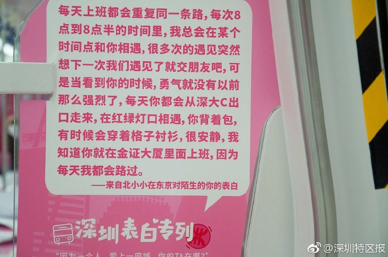 據(jù)深圳特區(qū)報報道:“同學,有沒有覺得對面那位很像你下任女朋友”,近日,深圳開了地鐵表白專列,將在1號線運行1個月,5月8號發(fā)車,每天巡回行駛,內(nèi)含單身專用車廂!上千條表白中有對喜歡的人的表白,有對父母的表白,對同學的表白。網(wǎng)友:單身車廂扎心了!