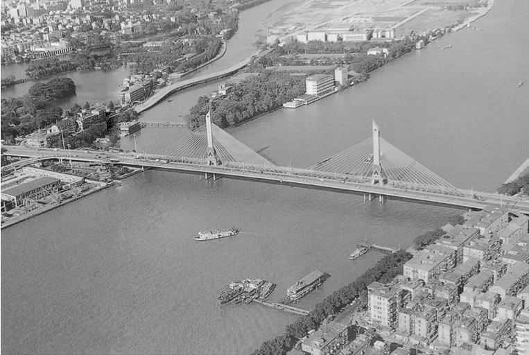 上圖:海印大橋老照片,該橋是雙塔單索面鋼筋混凝土斜拉橋,大橋從北岸東湖路起跨珠江至南岸的東曉路;下圖:2017年海印大橋航拍圖(拼版照片,2月18日攝)。新華網(wǎng)發(fā)陳鴻攝