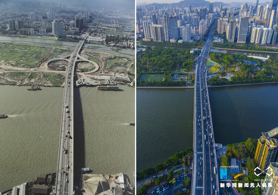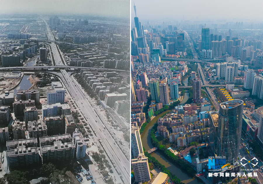 《廣州城建豐碑》一書里面收錄了幾張難得一見的航拍老照片。日前,新華網(wǎng)無人機(jī)在相同角度實拍對比,記錄了廣州城市交通及周邊環(huán)境的變遷。