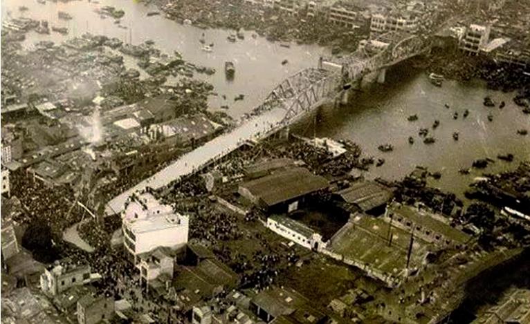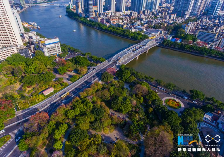 上圖:海珠橋老照片,建于1933年的海珠橋是廣州市第一座跨江大橋,南北兩跨對稱布置;下圖:2017年海珠橋航拍圖(拼版照片,3月2日攝)。新華網(wǎng)發(fā)陳鴻攝