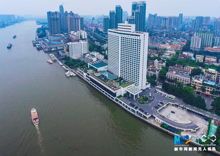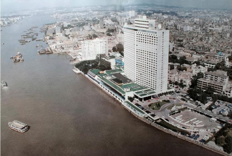 上圖:位于沙面的白天鵝賓館,建于1983年2月,共34層,主樓大廳中庭置一個以“故鄉(xiāng)水”為主題的嶺南庭園;下圖:2017年白天鵝賓館航拍圖(拼版照片,5月5日攝)。新華網(wǎng)發(fā) 陳鴻攝