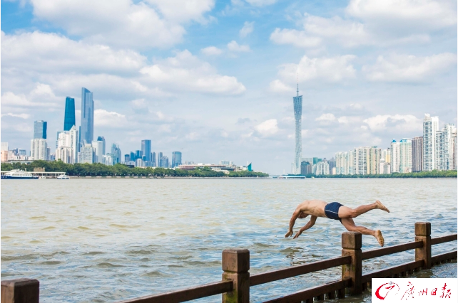 2017年5月16日,暴雨過后,廣州市區(qū)空氣清新,能見度極高,處處皆美如畫卷。圖為濱江西路親水平臺(tái),市民趁著好天氣在珠江里游泳。廣報(bào)全媒體記者陳憂子攝