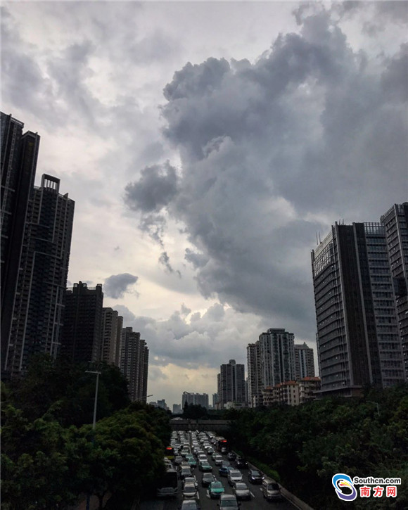 南方網(wǎng)訊 21日下午三點(diǎn),廣州烏云雷雨滾滾而來(lái),廣州市區(qū)瞬間被雨霧籠罩。