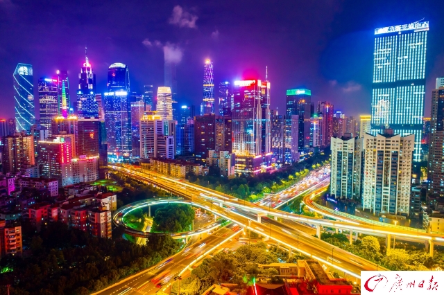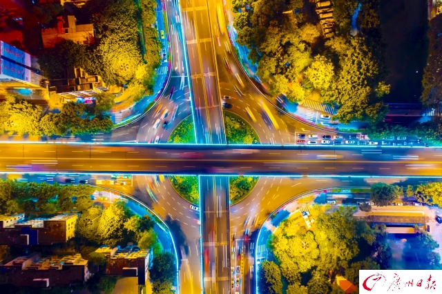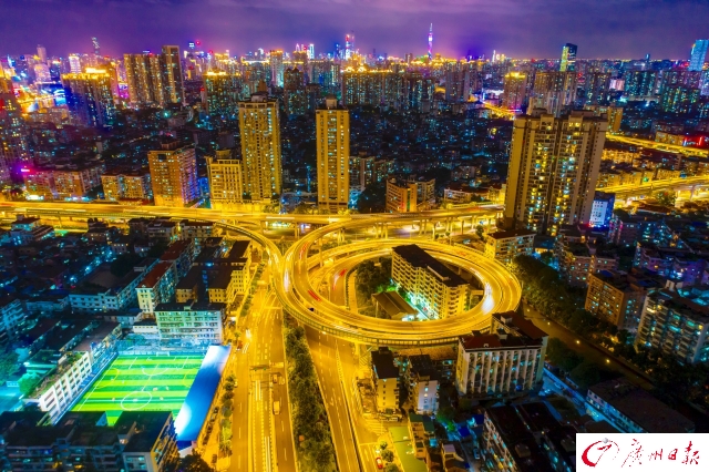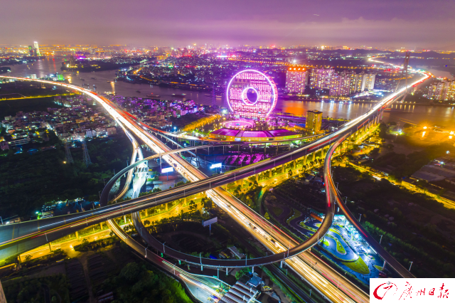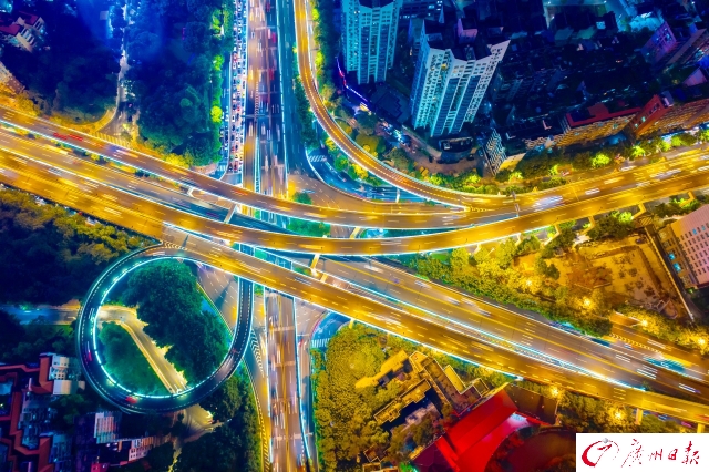 記者在傍晚時分航拍了廣州城內(nèi)川流不息的交通樞紐,用全新視角為你展現(xiàn)燈火通明、流光溢彩、氣勢磅礴的廣州之夜。夜色下的廣州立交橋車水馬龍,如同一條“黃金彩帶”;東塔、西塔和廣州塔更是交相輝映,美得讓人窒息。