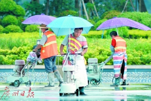 廣州海心沙,工人在特制的遮陽(yáng)傘下打磨音樂(lè)噴水池的地面。